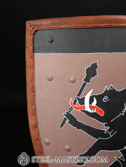 Triangle shields like that were really popular among European knights in the XII-XV centuries. Evolved from kite shields, this triangle cutie was very popular because of simple design and inexpensive manufacturing.