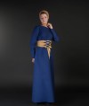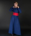 There is a chaste long Middle Ages dress with long straight sleeves, plain boat neckline and wide belt, which emphasizes design and adds majesty and elegance.