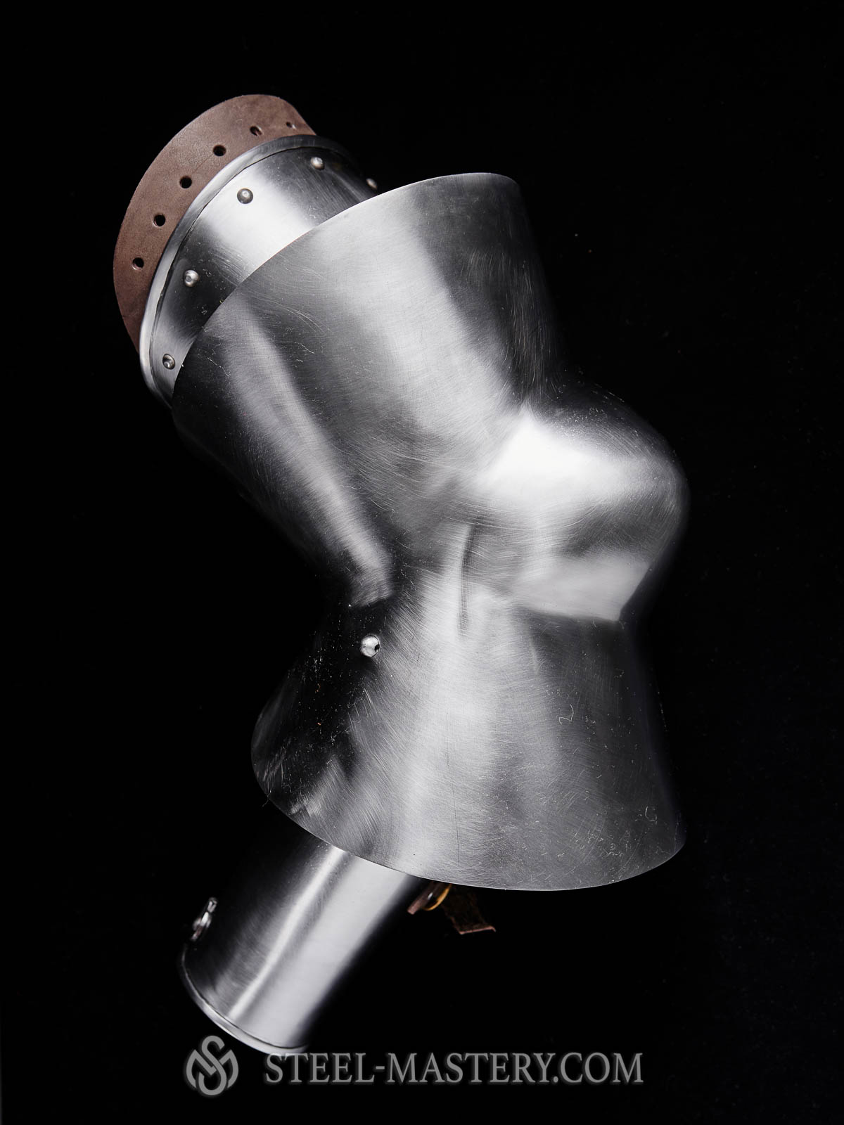 This plate arm defense has classic shapes of Milan-style armour. For the forced protection, a couter is fixed to the left arm. Italian pauldrons of the same style will be a great addition to this arm guard.