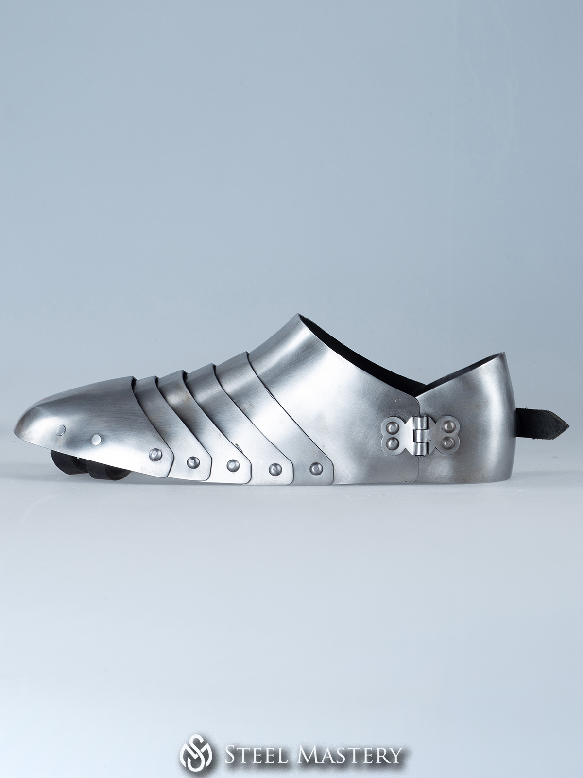 Based on the the Royal Collection, Leeds, England. Our blacksmith recreated the exact shape of historical sabatons. It has seven plates constructed to follow the foot shape. The heel plate is articulated and hinged on the inner side, while it fastens with a strap on the outer side.