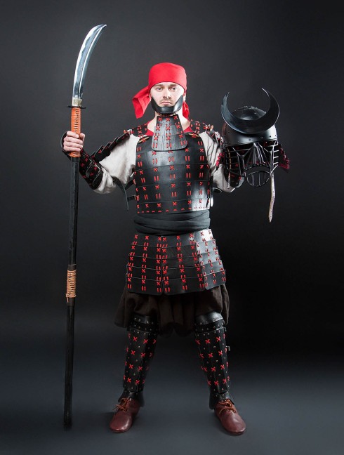 That is a set, strong, modest and genuine, just like legendary sōhei Benkei, who provided inspiration for our artisans for this Japanese samurai leather warrior armor. Helmet Kabuto and sword naginata are not included to the set. But, we recommend you to complete this leather set and order this medieval Japanese helmet. Besides, with Buddha’s blessing, after well-beseeming meditation, Steel Mastery blacksmith is ready to make haramaki (it is domaru, fastened on the back, not on the sides) and even one-of-a-kind and splendid O-yoroi for aficionados of beautiful armor.