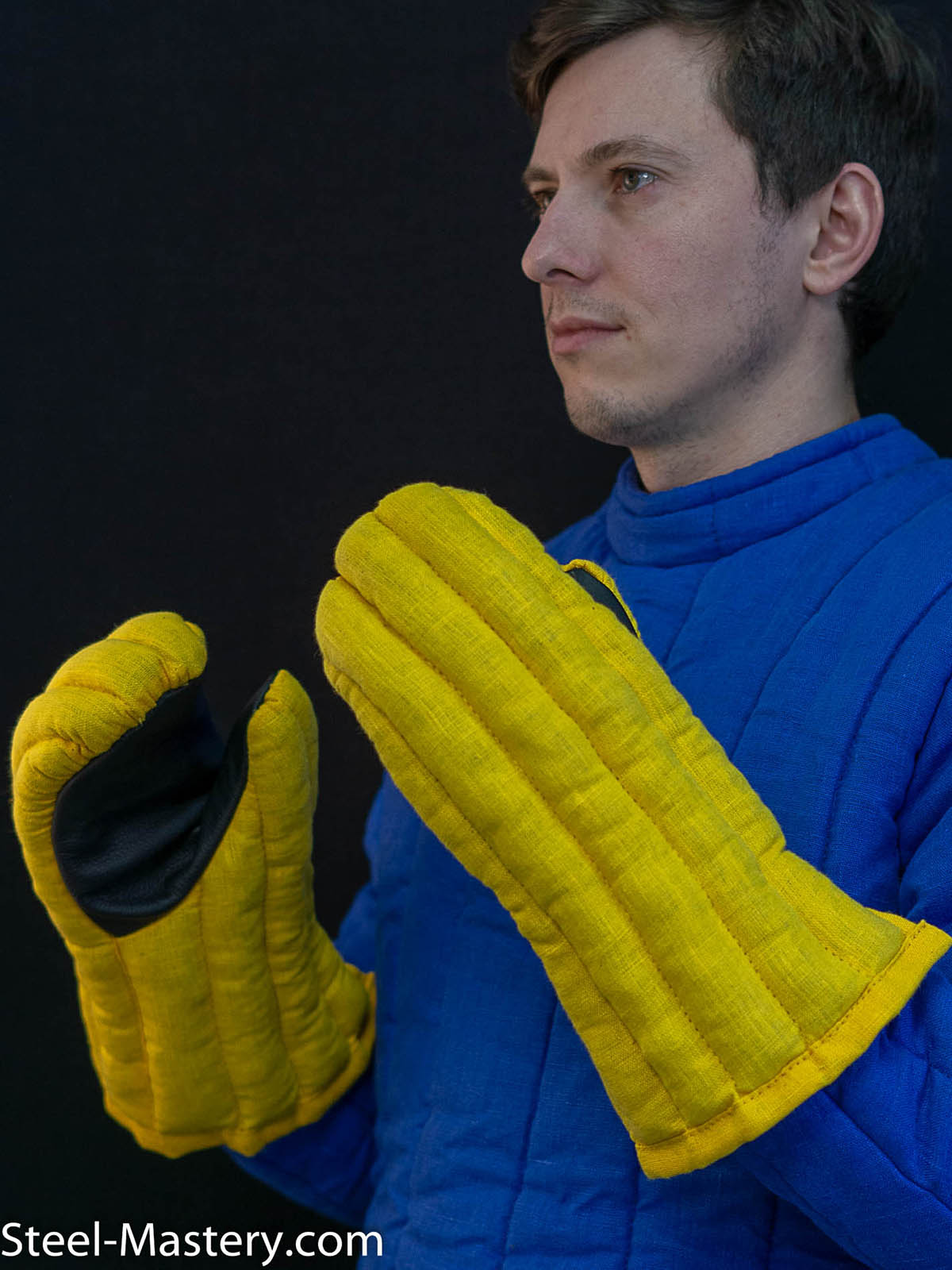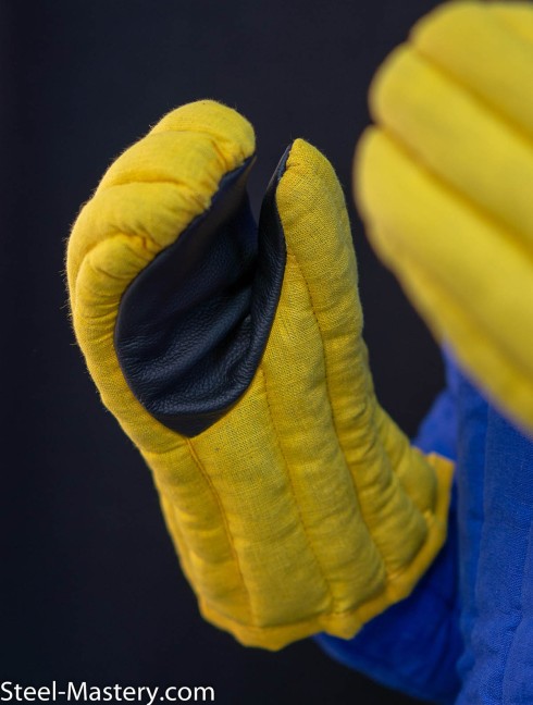 These 2-finger padded cotton gauntlets with leather patches give a good protection for hands during medieval swordcraft training or fencing.