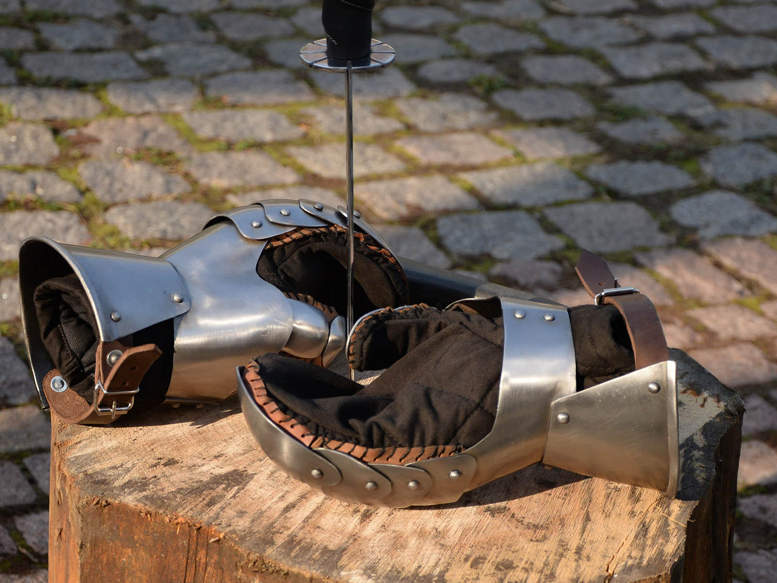 Wide metal plates allow good and firm hold of weapon without worrying about hands’ safety. Firm and soft croupon leather, belts with steel buckles, thick padded cotton mittens from the inside – that is how modern metal armor looks like.