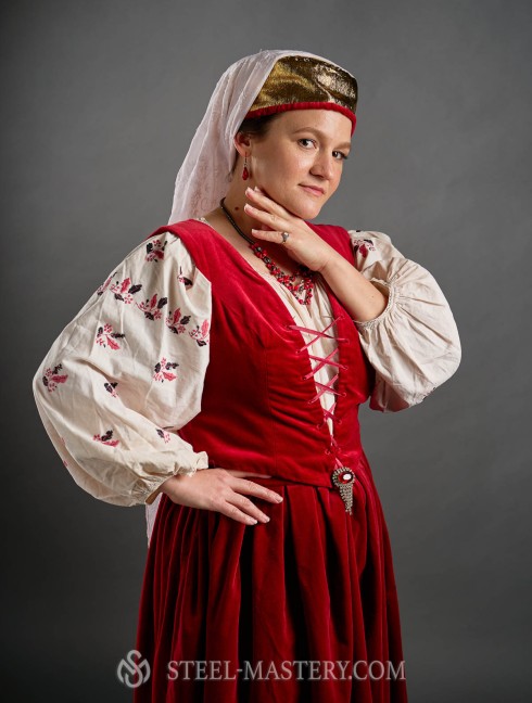 The dress is sewn in luxurious scarlet velvet, it is cut and gathered with soft pleats at the waist, laced at the chest with the same scarlet silk lace showing off the undershirt. The neckline, armholes of sleeves, and skirt’s hem can be decorated on your wish with contrasting ribbons, strips of fabric, golden or silver embroidery, pearls or stones. Such a dress can be made of wool, linen, velvet, jacquard.