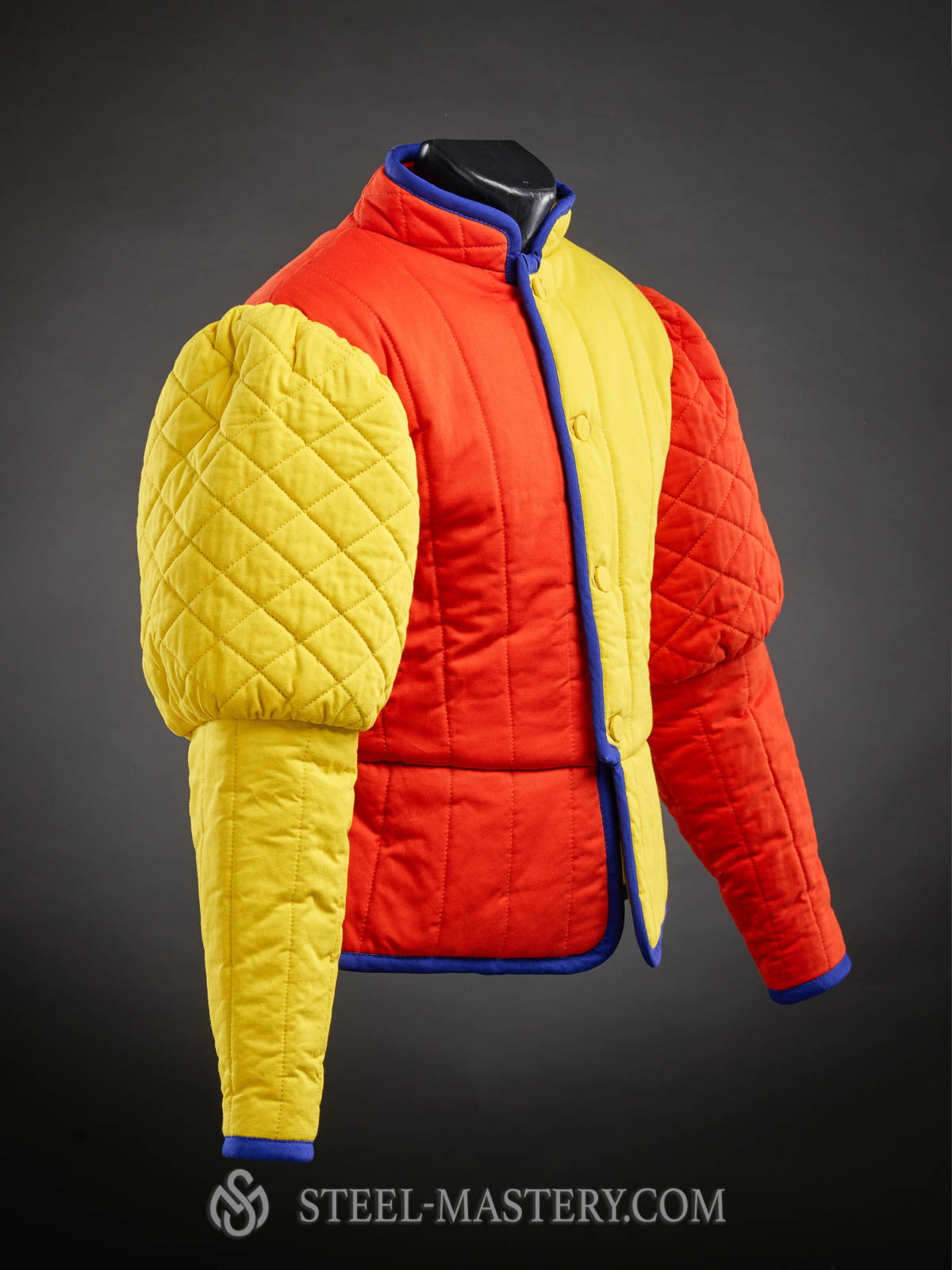 So, by choosing what piece may we offer you from the men’s wardrobe of the middle of the XV century, we could not leave out a farsetto. After analyzing of the existing graphical sources and descriptions, Steel Mastery crafters took the best from the each and recreated the generalized look of the perfect arming doublet – farsetto, which is appropriate in any corners of XV century Europe. Short tight silhouette, narrow sleeves with puffs, short and tough collar. We decided to fasten men’s doublet farsetto with light brown leather belts with stylish cast buckles of golden color. However, by your regards, we may replace them with buttons or leather laces. This classy padded doublet is decorated with vertical stitching and puffs – with contrast diamond-shaped stitching.