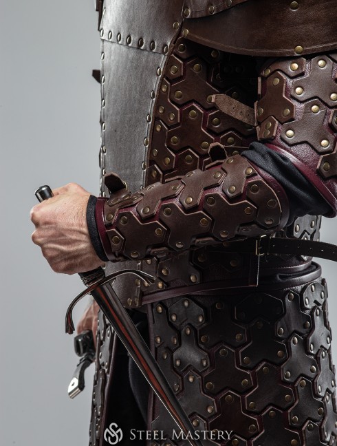 For lamellar scales and big plates, we chose the strongest belt leather 3-4 mm thick. Gorgeous and smooth with a barely noticeable matte sheen, it looks cooler than steel and protects almost as well.