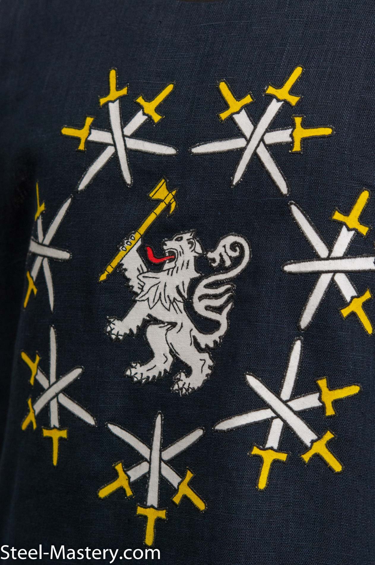 There is quite unusual medieval linen tabard, one-colored, decorated with a lot of swords and lion with an axe.