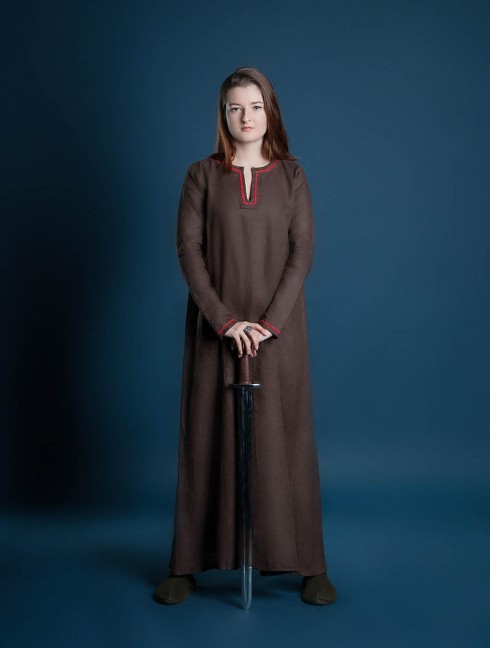 Undershirt (medieval chemise) is made of linen and decorated with hand-made embroidery around neckline and cuffs.