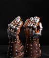 Thick and soft leather, light and firm cold-rolled steel, steel rivets and buckles. These brigantine armour gauntlets are simple and reliable as much as brigand armor can be.