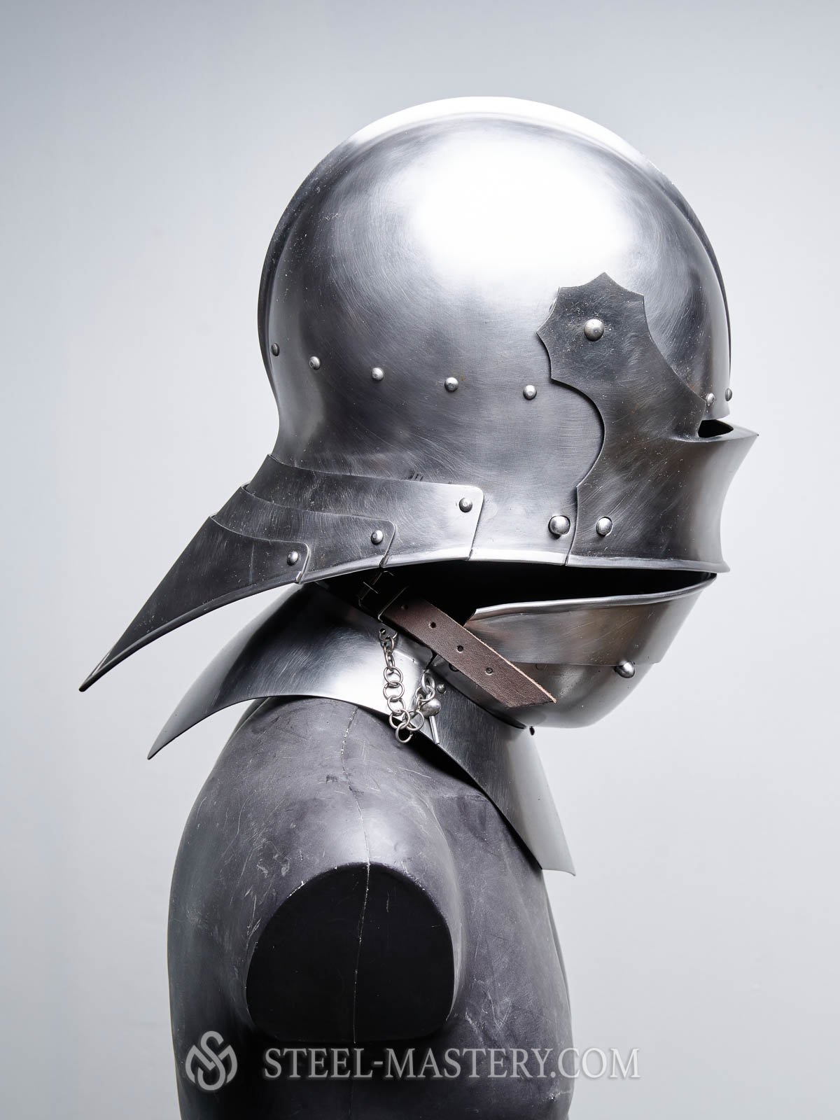 Visored sallet with bevor is a typical head armor, which was used by French knights in the XV century. Originally, sallet appeared in Italy in the Xv century. It replaced bascinet helm and gained great popularity among European warriors.