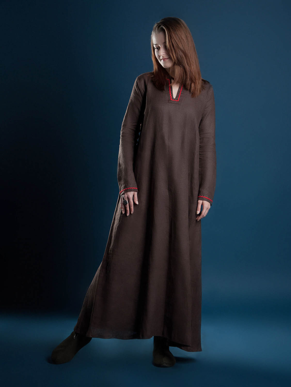 Undershirt (medieval chemise) is made of linen and decorated with hand-made embroidery around neckline and cuffs.