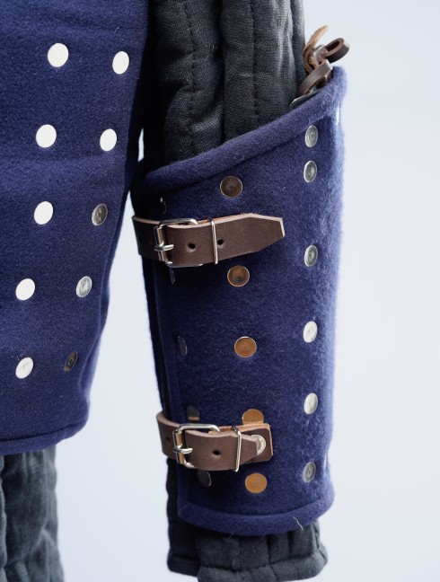Woolen medieval bracers are fixed on the forearm with high-quality leather straps and buckles.