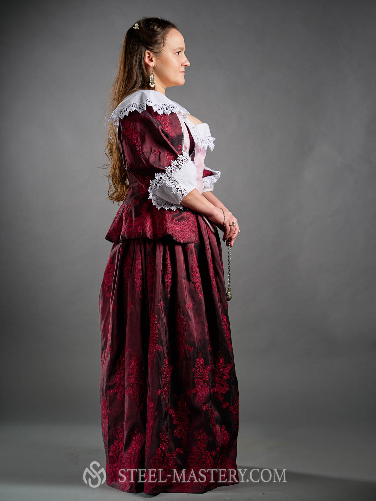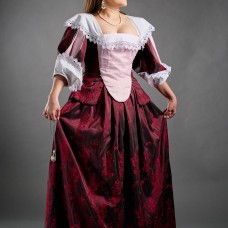 Upper/top skirt is made of luxurious embroidered wine-coloured taffeta. And the front insert (stomacher) is made of patterned brocade. Jacquard, brocade and silk were also popular as a base and additional fabric. And on request we can sew a version made of velvet or wool. You can also add a petticoat on the skirt.