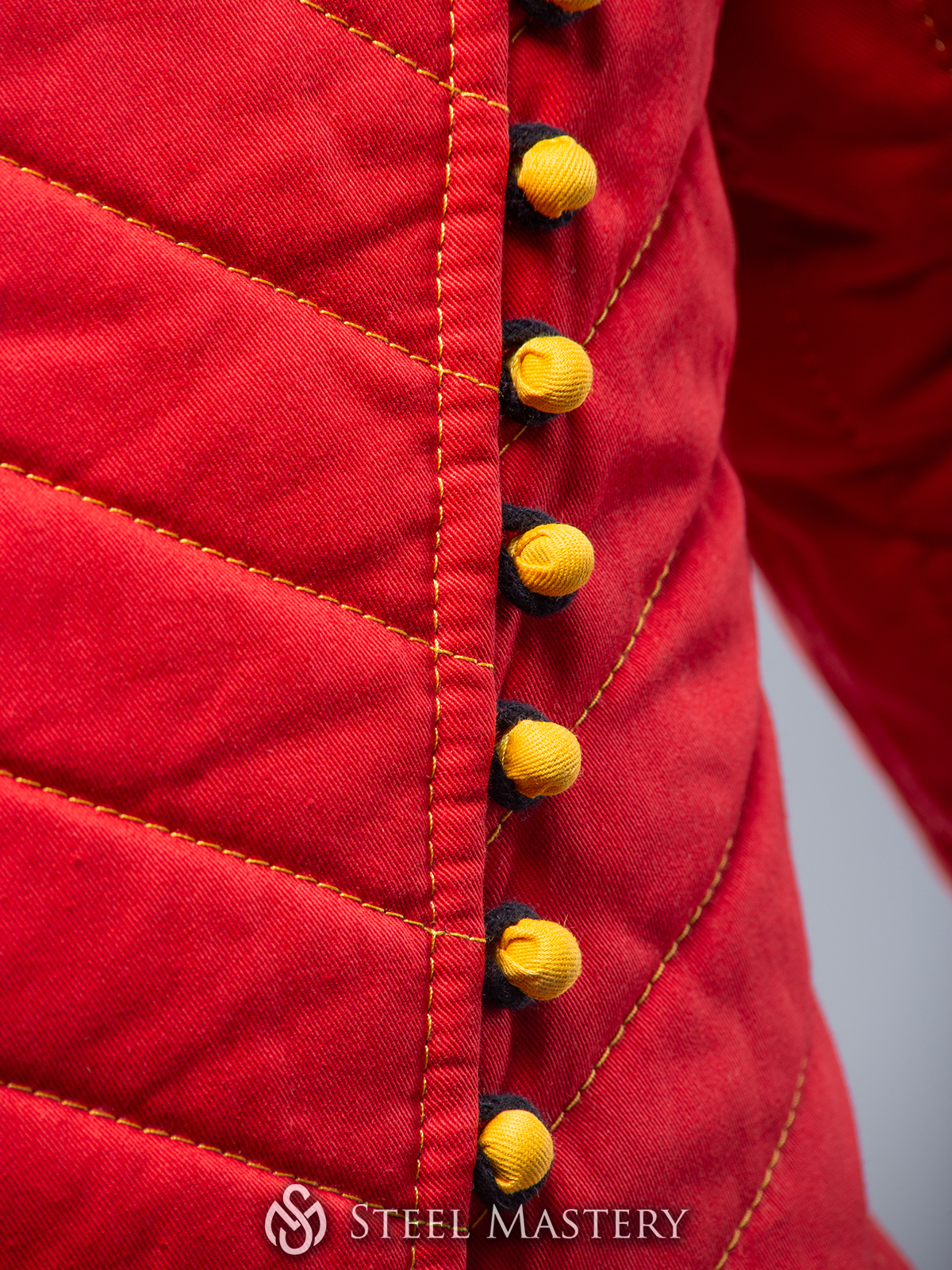 This padded HEMA gambeson inspired by classic fencing camisole silhouette has high stand-up turn-down collar and traditional chest overlapping.