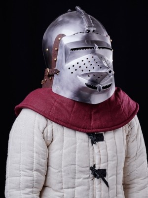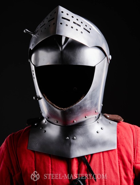 Neck is protected with movable plate gorget (bevor). Visor is fixed with push button, so you may be sure that it will not open during the fight.