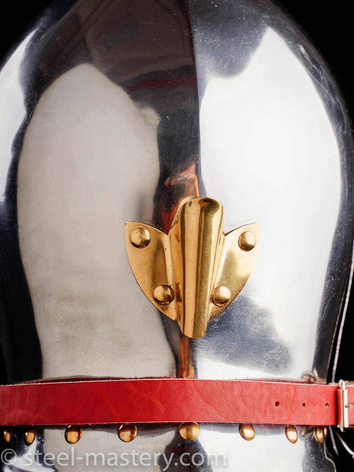 Original helmet is a little bit rusted and has lost the front gorget plate for which there are holes in the fold of the dome. But we have corrected those shortcomings by recreating a luxurious, sparkling replica of this museum’s old man. And notice the chic golden lily on the back of the head.