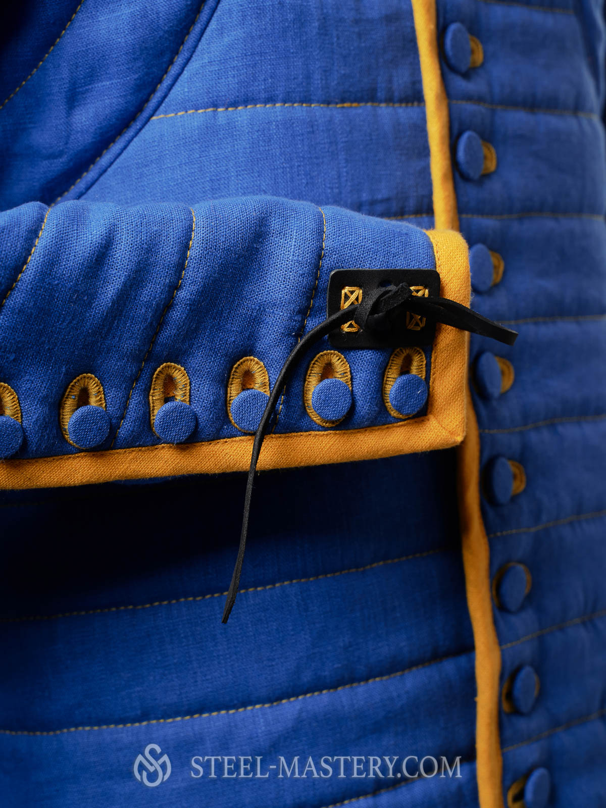Padded gambeson of blue or green colors are the most popular, but in options you may choose wine-red, brown or other colors.