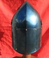 This beautiful blued Sugarloaf helmet was popular among medieval European warriors in the first part of XIV century. Head protection of such type evolved from the Great helm (Topfhelm). However, in distinction of pot helm, sugarloaf has conical shape of dome and movable visor.