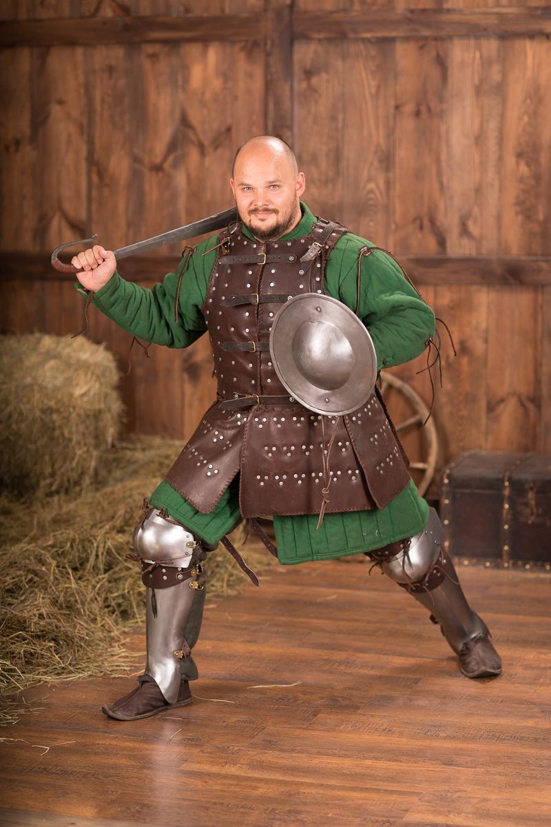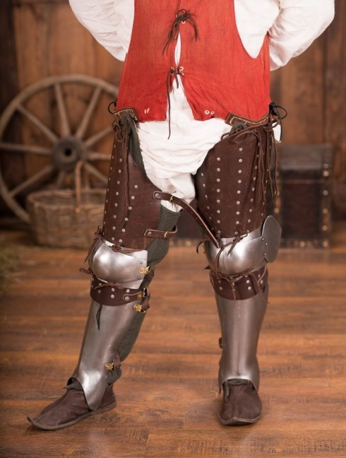 Knight on the main photo is equipped also with helmet bascinet with visor “Wolf ribs”, steel shield buckler and plate greaves. You may order these items separately at our medieval armor shop. We recommend using of brigandine protection only over padded chausses and gambeson.