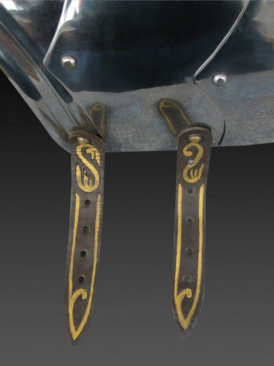 Reliable metal armor with skirt (faulds) consists of two parts: front and back one. Parts are connected together with firm leather belts for fastening, which are installed on the shoulders and sides.