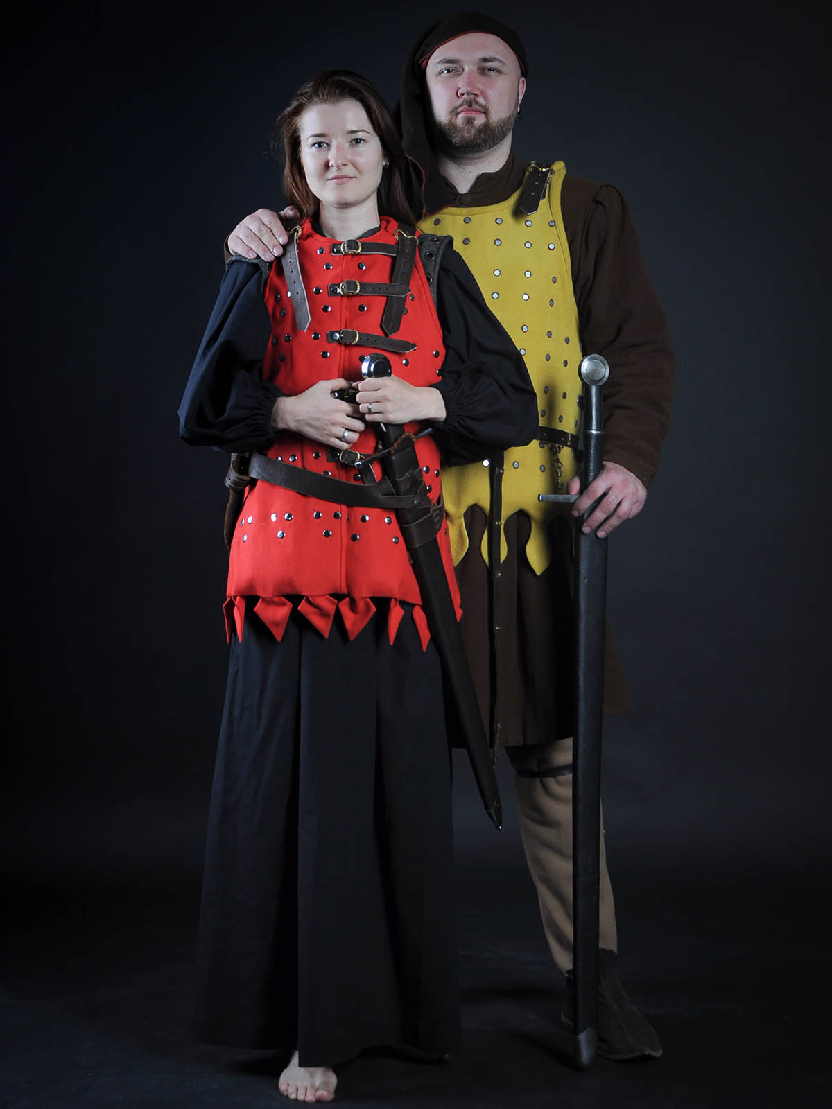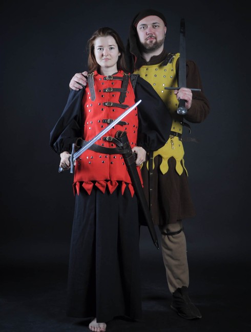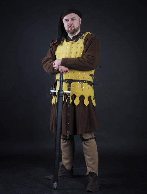 Various fastenings and types of decoration are available for order. We can make an embroidery of your heraldic emblem on the brigandine, or decorate the bottom edge with fancy festoons. Brigandine, whole-hammered or metal spaulders provide with additional protection.