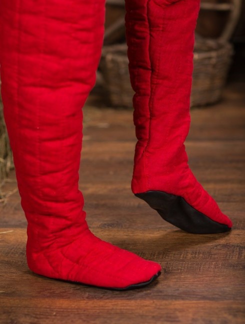 Classic medieval padded chausses can be used almost with any type of armour. They provides with perfect additional protection of legs, amortize strikes will and do not limit mobility. Leather sole makes chausses very comfortable. Chausses are being fastened with leather string to the wide fabric belt.