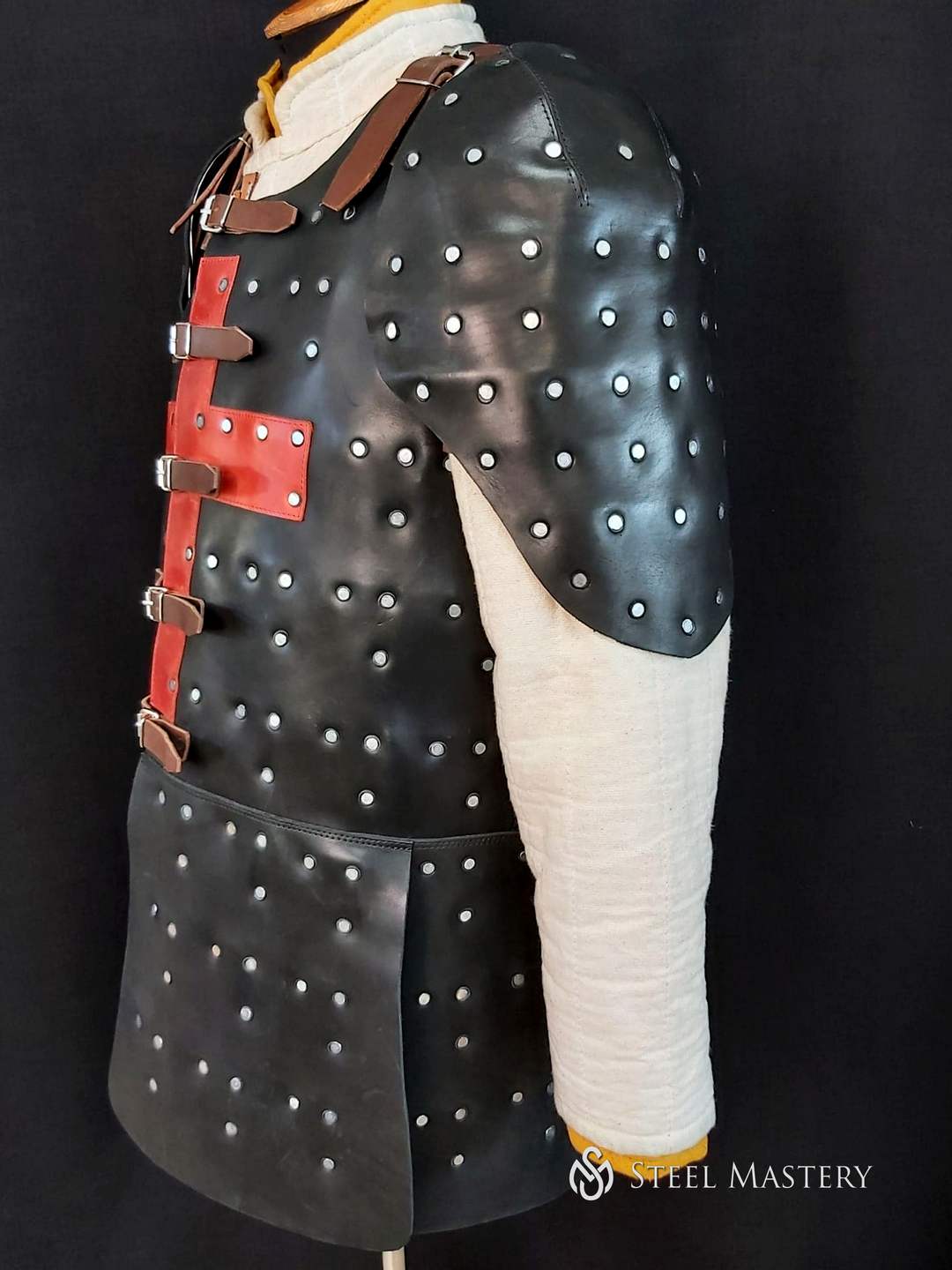 We recommend wearing of such medieval body armour over the padded gambeson. Brigandine arms and legs protection will be perfect addition.