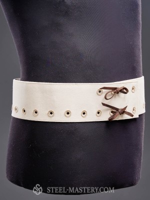 It is being fastened to the gambeson or doublet with leather straps. There are drawstrings on the calves for comfortable and tight wearimg, that is very important when using closed hinged greaves over the chausses. It has fabric lace.