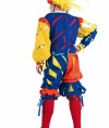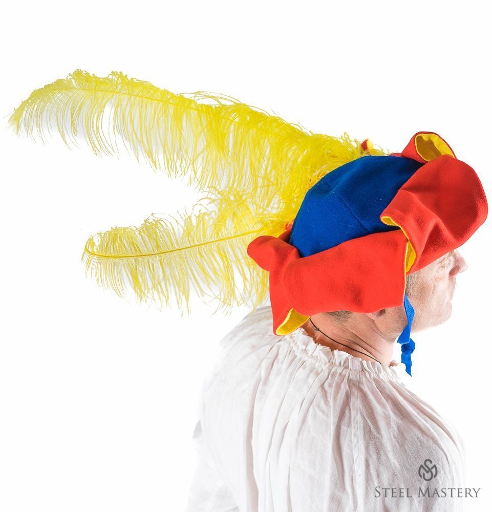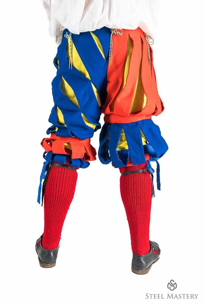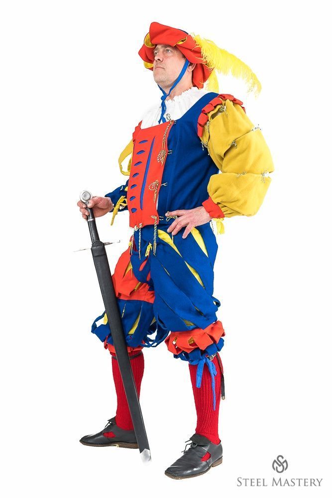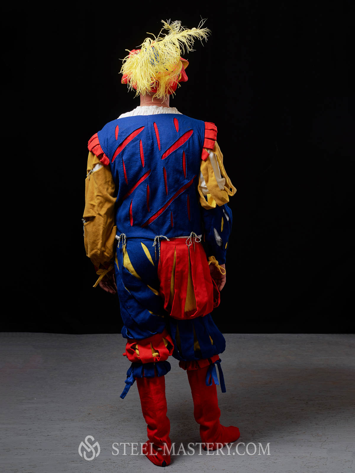 This garb of medieval German soldier combines the most typical features: bright coloured fabrics, slashes, cuts, puffed sleeves.