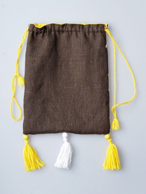 It is made with linen brown fabric and decorated with woven string in diamond style with 3 tassels on the bottom edge.