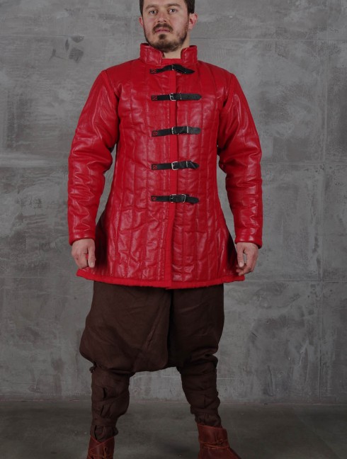 Leather is main material for this type of gambeson. We may make it of black or red leather or of unusual wine-red or yellow leather. Here is one more model: medieval aketon of leather of the XV century. Leather armour for LARP or fantasy style events are in corresponding category.