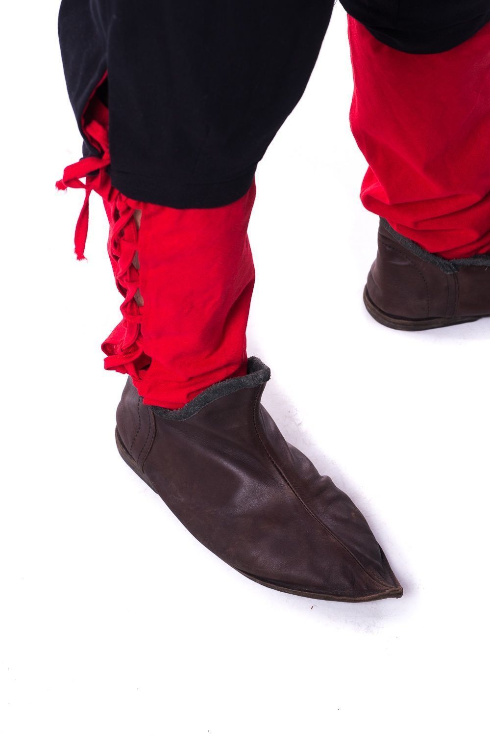 Hose have cut from the ankle from the outside. Hoses can be drawed tight with strings, that are passed through the loops.
