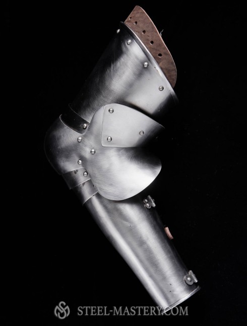 This plate arm defense has classic shapes of Milan-style armour. For the forced protection, a couter is fixed to the left arm. Italian pauldrons of the same style will be a great addition to this arm guard.