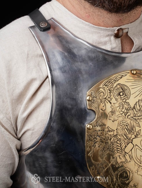 One-piece breastplate has appeared in the late XIV century. This part of armor was in use by knight of all military branches for centuries. Chest plate could be used as a single item for torso protection, so together with back plate – in this case, such plate body armor called cuirass.