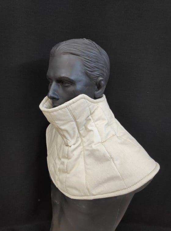 This medieval padded aventail is worn under the Bascinet or Barbute type helmet. Its cut provides perfect additional protection for the shoulders and neck. High front padded part covers your chin.