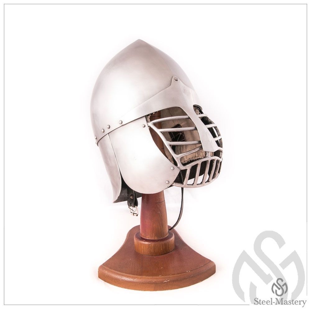 Crown of helmet is elongated and has slightly inclined top. There are nasal plate, cheek guard and neck plate from the back of helmet. Bar grill visor provides with perfect visibility and breathing during the bohurt of medieval fencing.