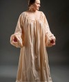 The dress is narrow in the bodice with a deep V-shaped neckline and exaggerated waist, while the puffed skirt falls to the floor in beautiful soft pleats. The dress is laced up the sides to fit the figure. This is a light version with only one dress, but for ladies with a true Italian passion at heart, we are ready to sew as it should be – 2 dresses. We chose a peach patterned jacquard with a large floral pattern for a dress, decorated on the edges with fine gold thread and gold ribbons for garter sleeves and lacing. Naturally, your dress – your type and colors of fabric and decorations, but we are always here to advise.