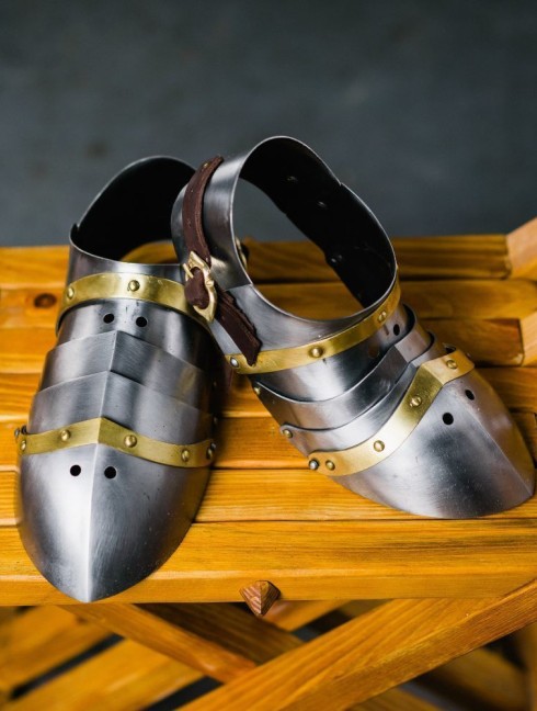 Sabatons are the plate shoes, and were used mostly by mounted knights. This model of the 1350-1450 years is a part of handcrafted full-plate medieval armor in Churburg style.