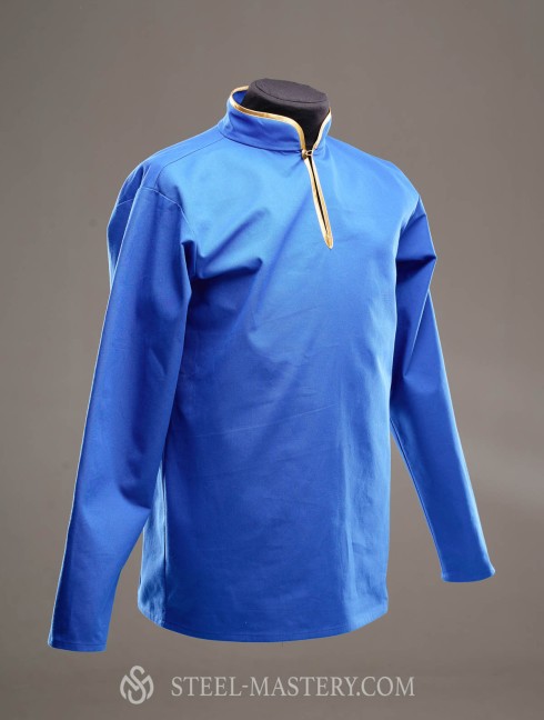 The short shirt is a part of costume of warrior, fantasy-styled character. It has round neck-hole with neckline, that is decorated with a trim.