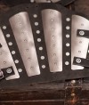For manufacture of this medieval arm defense, our crafters use firm but elastic croupon leather of thickness 3.5-4 mm. There are leather belts with steel buckles installed for the fixation on the arm. Holes on the top of bracer allows lacing them to your padded gambeson.