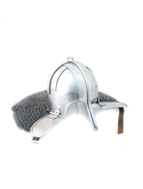 This crested head protection is completely handcrafted. We do recommend to wear it together with mail aventail for better protection.