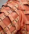 Not a simple dull brigantine, but a soft and thick leather base braided with wide leather straps with bronze rings woven into them. The entire set is made of golden-sand leather in two shades and studded with tiny bronze rings that sparkle across the surface like tiny suns.