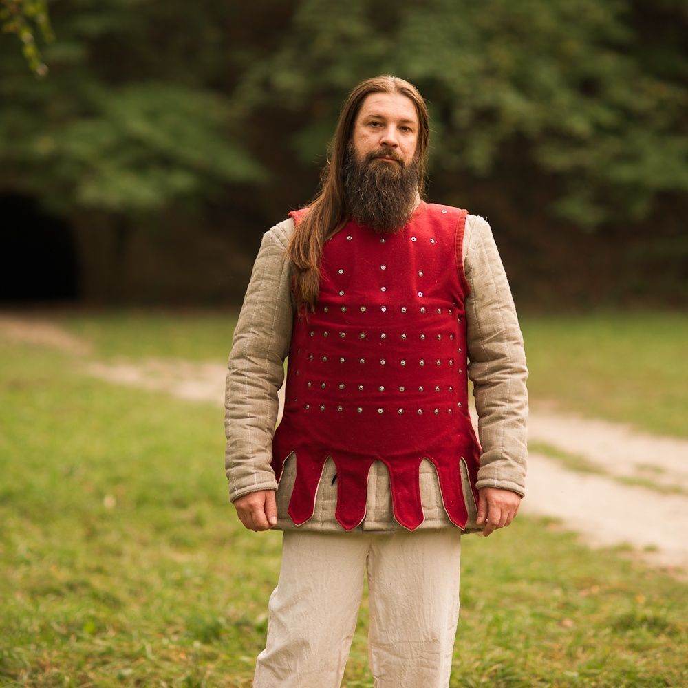We offer wool, suede, velvet or leather for cover layer of your medieval body armor. Plate for brigandine can be made of cold-rolled steel, stainless steel or titanium of different thickness.