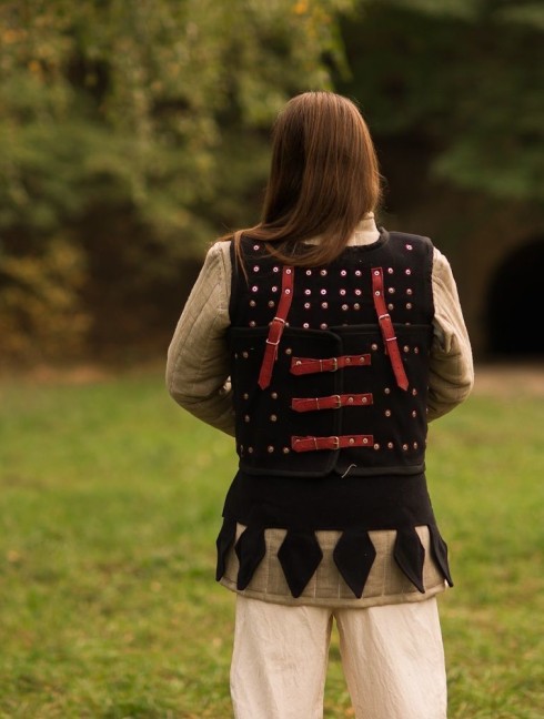 Various fastenings and types of decoration are available for order in options. We can make an embroidery of your heraldic emblem on the brigandine, or decorate the bottom edge with fancy festoons. Brigandine or whole-hammered spaulders provide with protection of your shoulders.