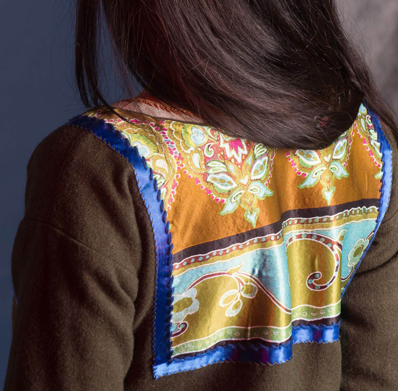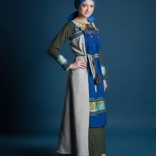 Dress is made of wool (not less then 80% natural wool). It is decorated with inserts of silk on the neckline and cuffs.