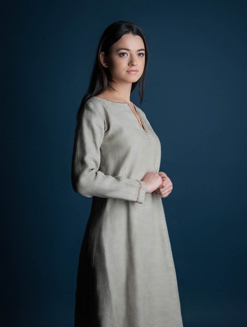 Undershirt (medieval chemise) is made of linen and decorated with hand-made embroidery around neckline and cuffs.