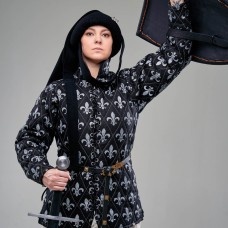 This stylish and modest linen gambeson is decorated with silver paint stamped French heraldic lilies that are the symbol of France – a country Jeanne d'Arc served and died for. In turn, silver stands for the white color in heraldry and symbolizes purity and innocence, which is also what the Maid of Orleans is famous for.