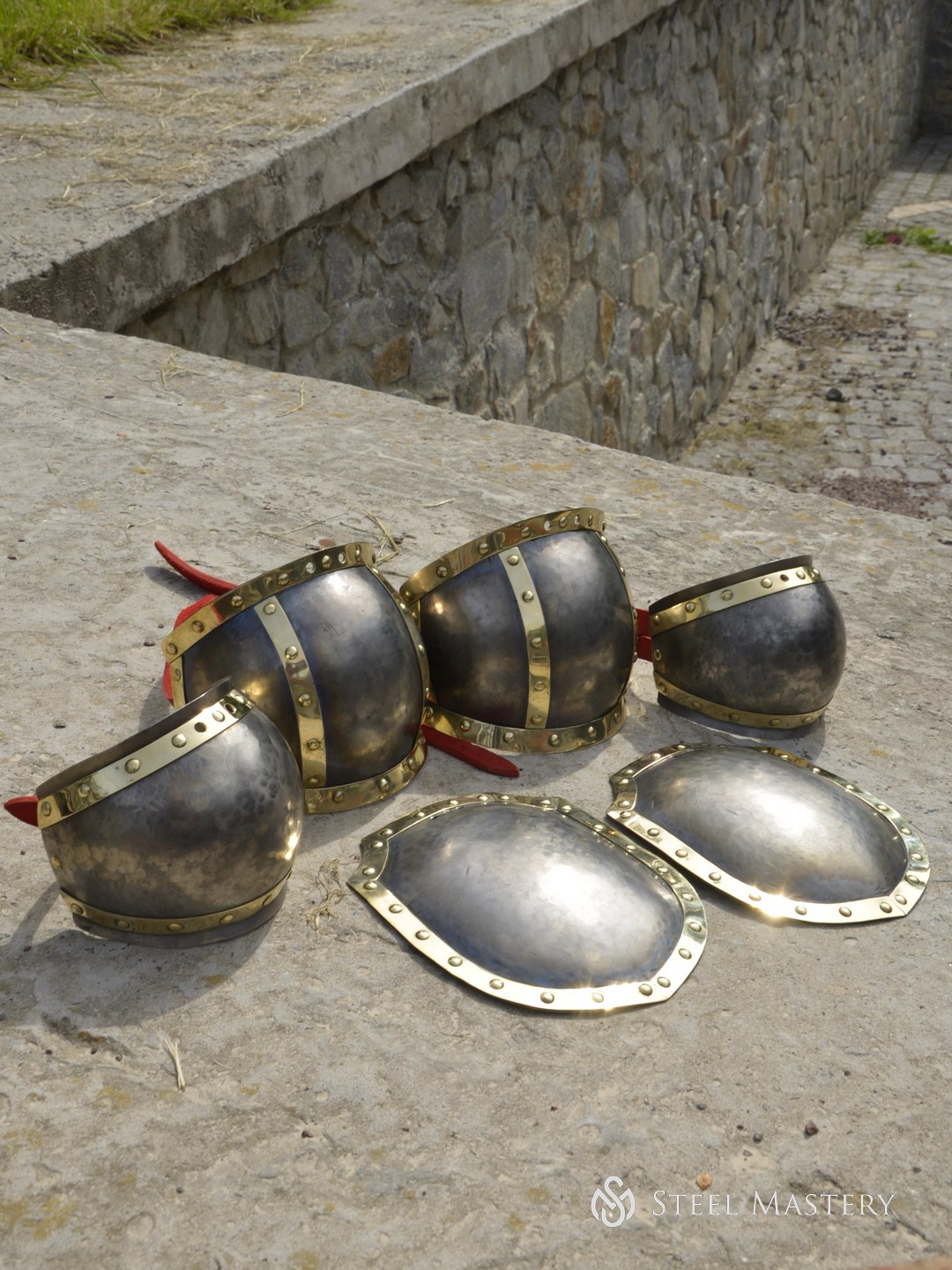 Shoulders with elbow caps, and knee caps are the parts of SH-02 (Brigandine armor set XIIIth century), but no one can stop the noble knight from wearing them with another set or on their own.