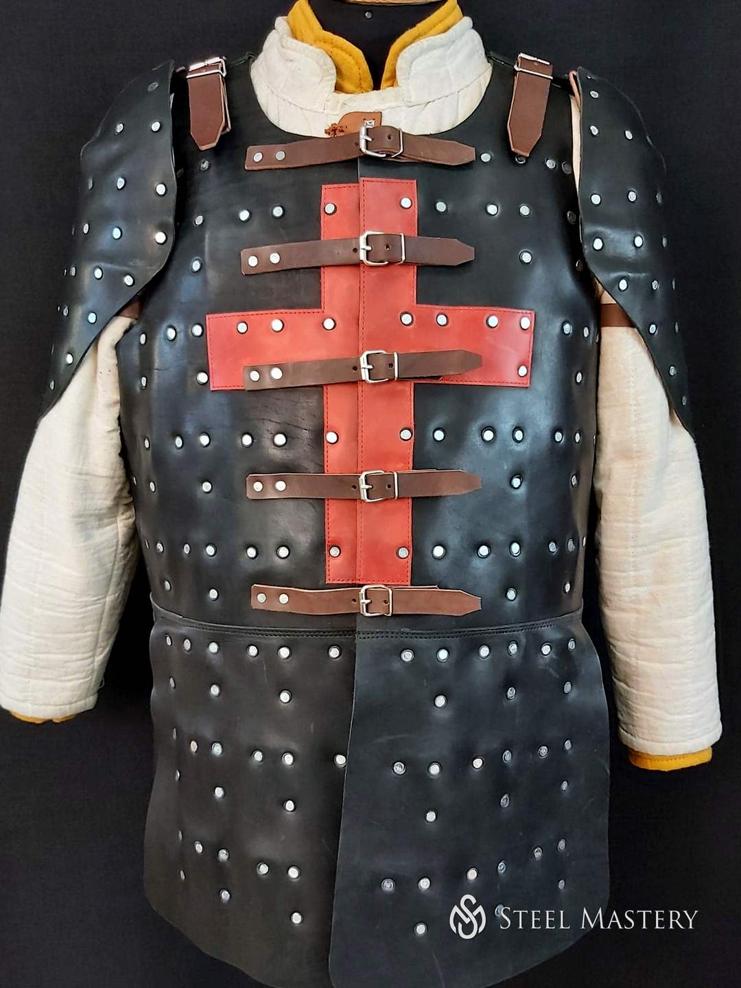 We recommend wearing of such medieval body armour over the padded gambeson. Brigandine arms and legs protection will be perfect addition.