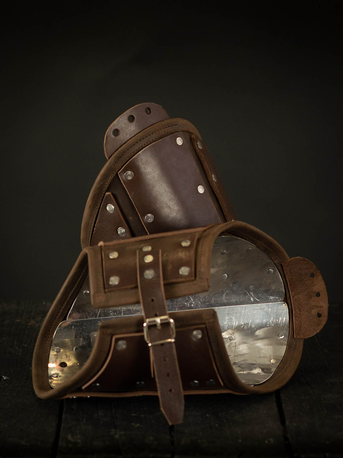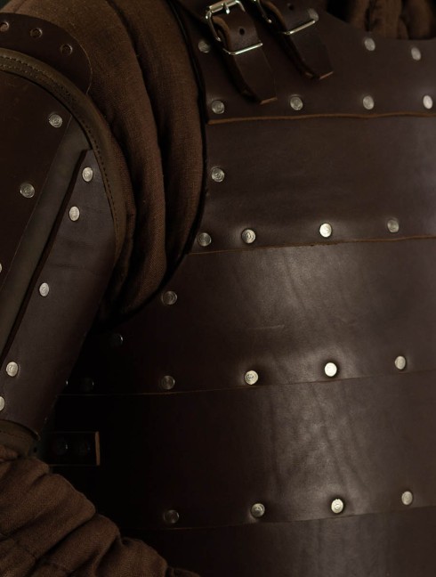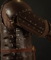 Cold-rolled steel plates of 1.0 mm are riveted from the inner side of matted firm leather. Additional leather strips are riveted from the outer side. Leather straps overlap meeting point of plates to increase protective qualities of this medieval leather armor, not leaving your enemy a single chance to reach your bicep!